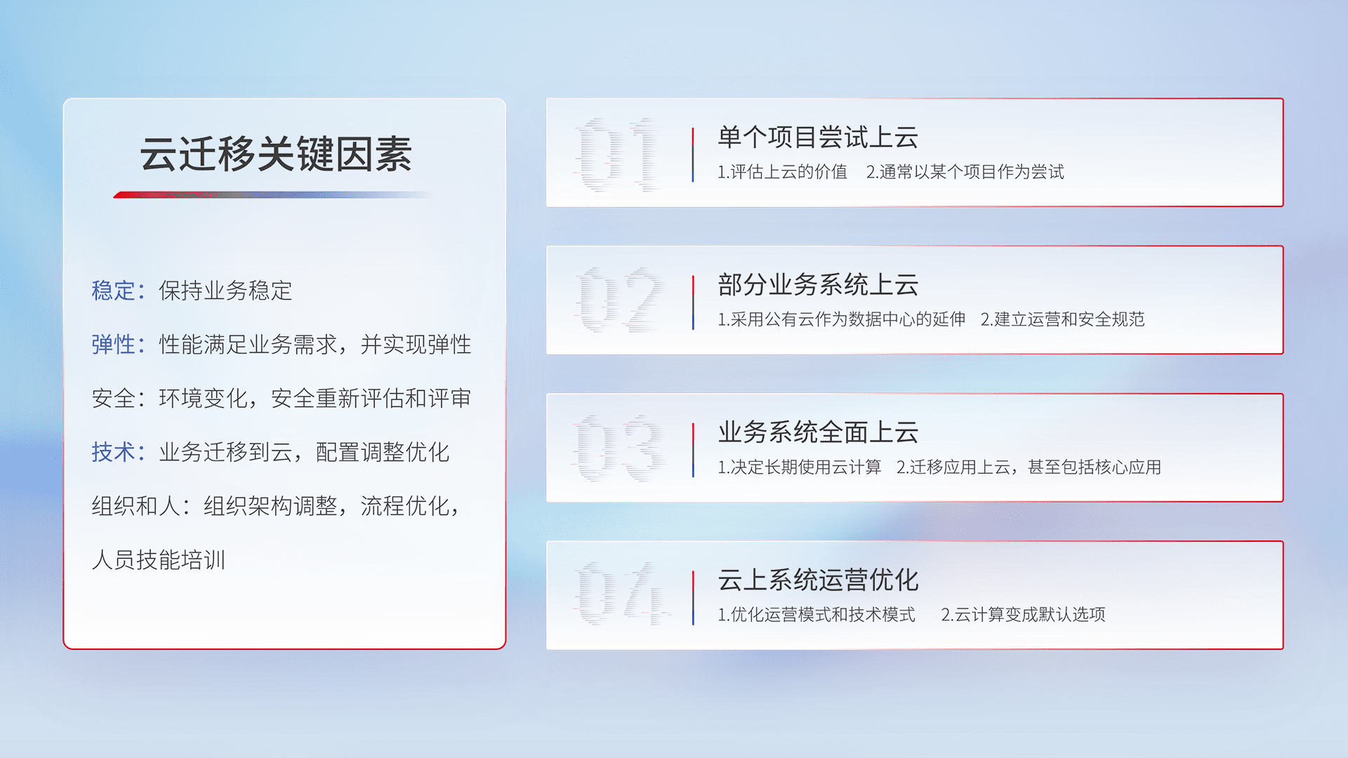 结合实际业务,,,,从规划设计、、、云平台选型、、云原生改造、、、数据迁移、、、、集成交付,,,,迁移全过程为客户识别最佳上云路径,,,做好风险识别管理,,,设计网络架构、、身份权限、、、、安全审计合规、、、、操作审计、、、日志审计、、、、监控告警策略、、、、多站点容灾设计等,,对云上基础设施进行整体规划,,,提升IT治理水平,,,,以满足弹性、、、高可用、、高性能的需求。。