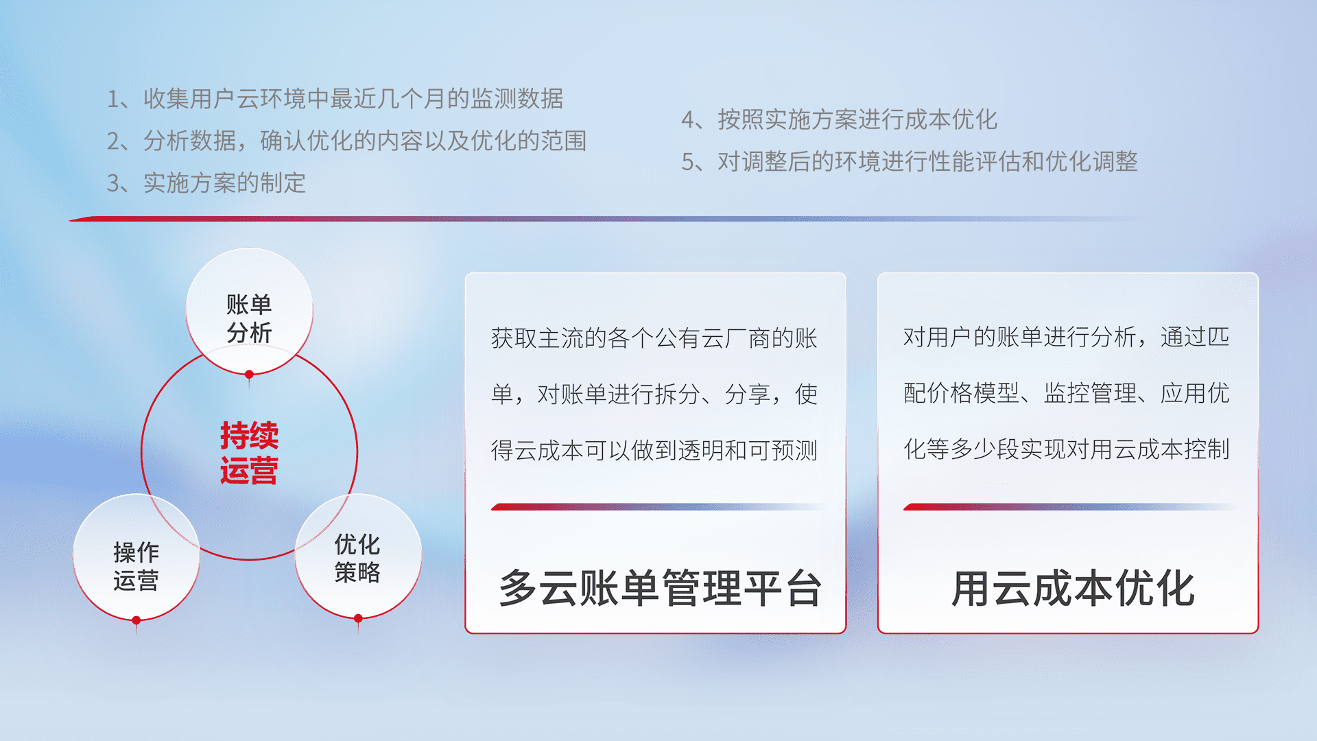 通过多云纳管,,以统一的资源数据模型把客户的云资源进行抽象和封装,,进而实现对多云资源的统一操作,,保障云资源管理的可靠性、、稳定性与可用性。。。量身定制化运维内容,,,,配置、、、、开发运维、、、、补丁管理、、、、备份、、监控、、认证和访问管理、、审计和日常巡检等,,保障在用云过程中的可靠度,,,稳定度以及高可用率。。